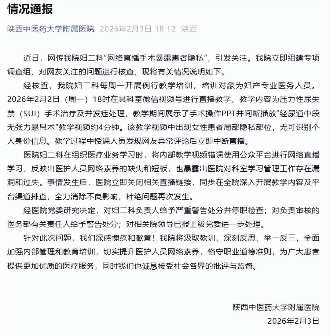 经核查,该院妇二科每周一开展例行教学培训,培训对象为妇产专业医务人员。2026年2月2日(周一)18时在其科室微信视频号进行直播教学,教学内容为压力性尿失禁(SUI)手术治疗及并发症处理,教学期间展示了手术操作PPT并间断播放“经尿道中段无张力悬吊术”教学视频约4分钟。该教学视频中出现女性患者局部隐私部位,无可识别个人身份信息。教学过程中授课人员发现网友异常评论后立即中断直播。