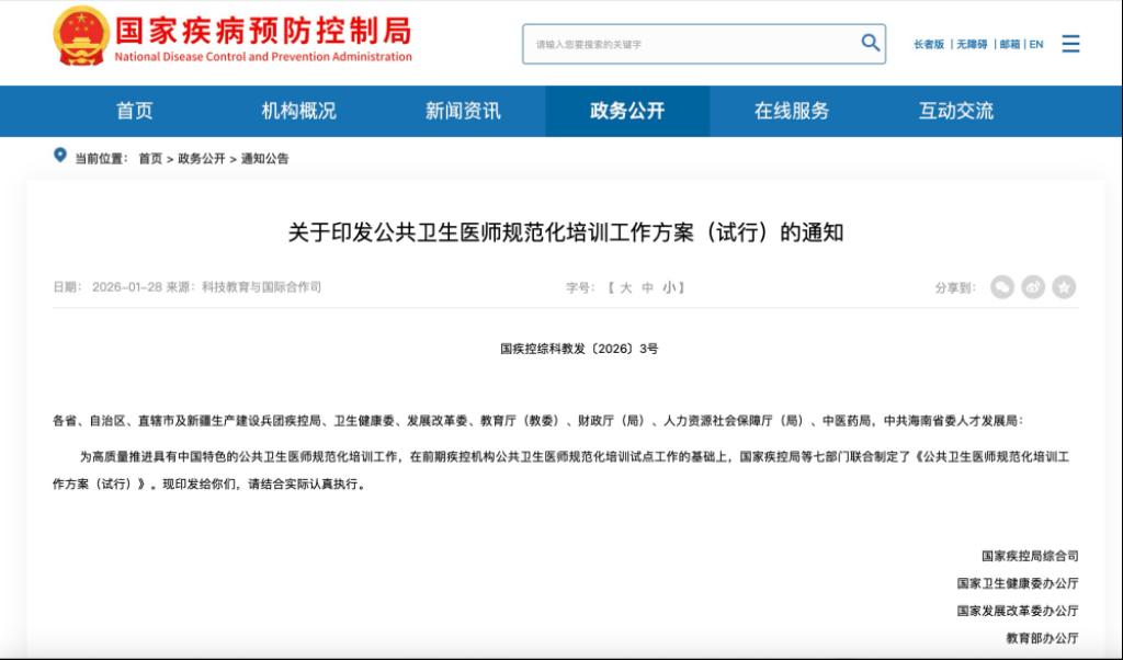 1月28日,国家疾控局等七部门联合发布《关于印发公共卫生医师规范化培训工作方案(试行)的通知》。方案明确,到2026年,各省(自治区、直辖市)公共卫生医师规范化培训试点工作全面启动;到2030年,每个县(市、区)均有接受过规范化培训的公共卫生医师;到2035年,基本建立公共卫生医师规范化培训制度。