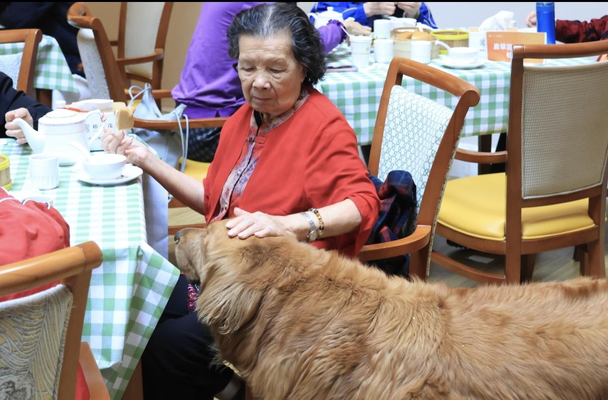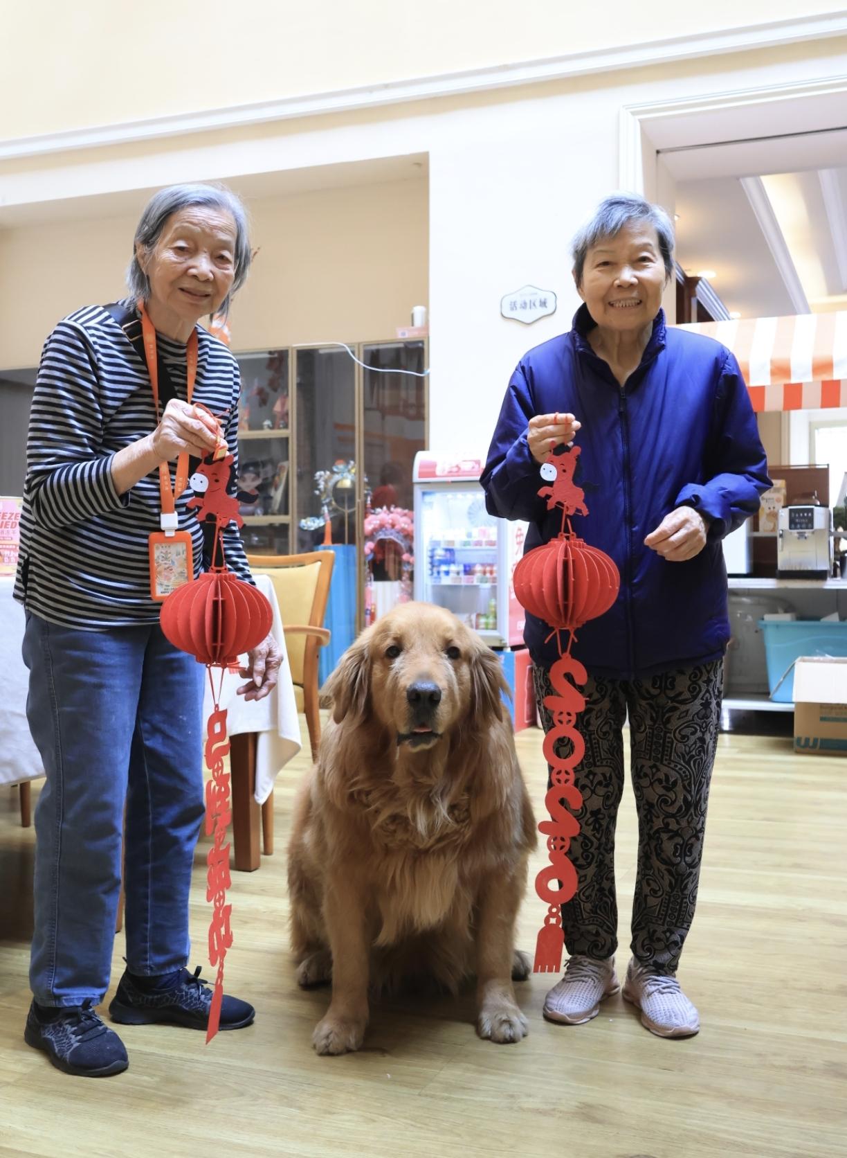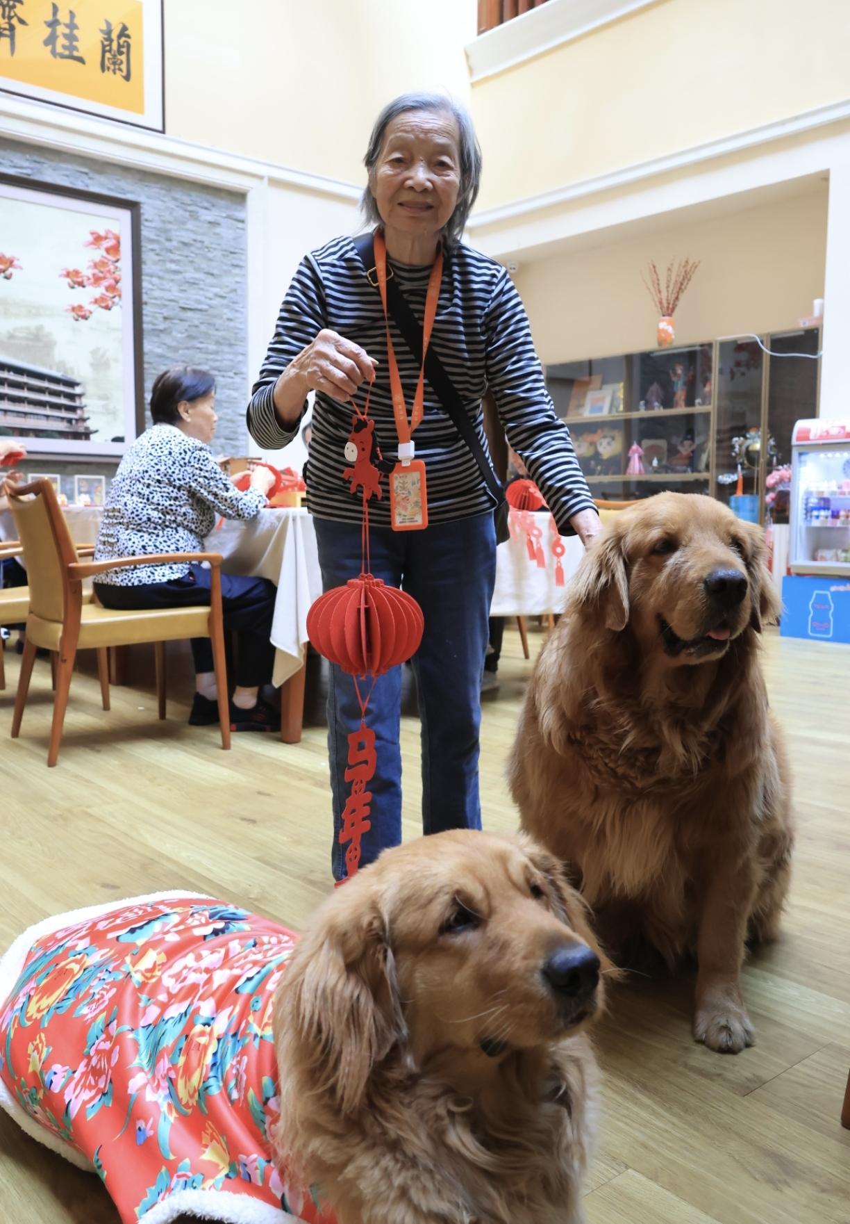 与蛋黄搭班的还有两岁的金毛犬大福。作为宠物治疗师,两小只均经过了情绪稳定性、亲人度等考核,疫苗、绝育一应俱全。它们给老人带来欢乐与被需要的情感联结。院长侯湘华说,这份陪伴是双向奔赴的,老人每天惦记着与狗狗玩耍,它们也记得每个人的脚步。