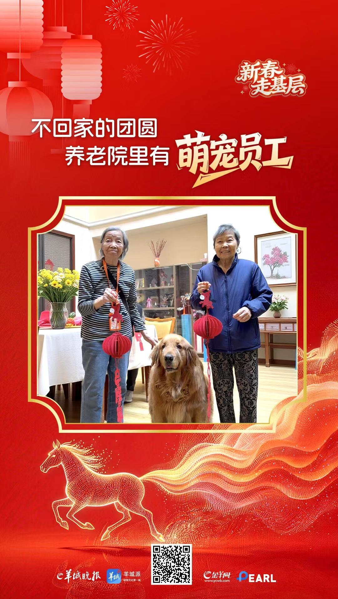 新春将至,当千家万户踏上团圆的归途时,广州番禺椿萱茂老年公寓里,贴窗花、写福字、炸煎堆……年味正浓。200多位老人中,选择回家的仅个位数。让他们安心留下的,除了专业照料,还有几位特殊“员工”带来的情感羁绊。