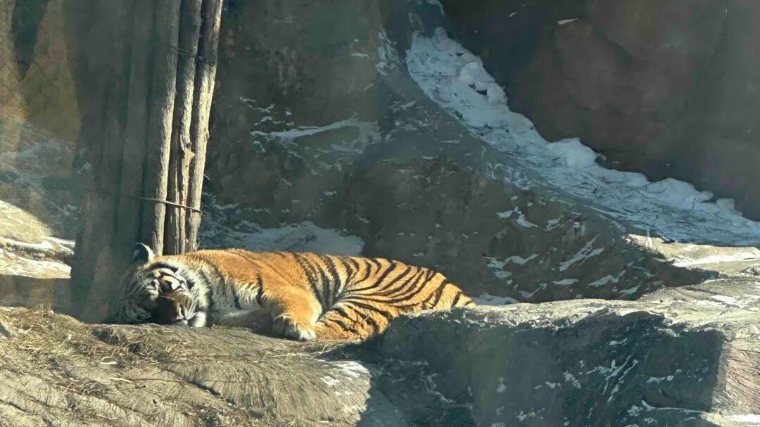 为了让游客不虚此行,司机将车辆驶向园区内一处假山区域。“咱们去松树下碰碰运气,说不定能碰到没吃饱的老虎。”车辆行至松树旁,终于发现一只东北虎静卧于此。司机介绍,这片区域平时会有三只老虎“值守”,当天只剩一只“坚守岗位”。