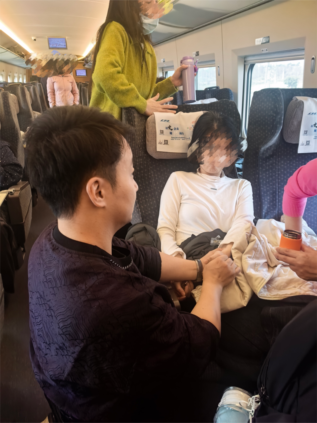 听到广播后,张曈第一时间赶到现场。只见一名年轻女性旅客突发不适,面色惨白、嘴唇毫无血色,整个人瘫软在座位上,母亲在一旁焦急万分,连声说女儿刚刚晕了过去,情况十分危急。